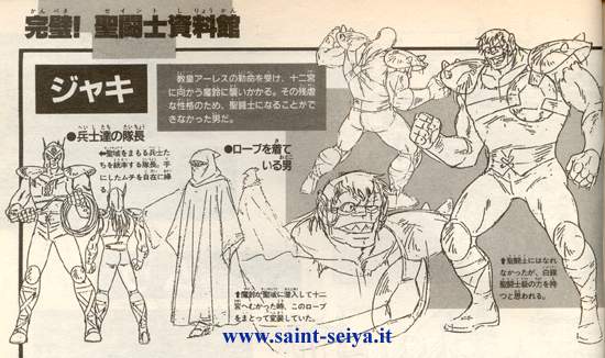 JAKI (Sanctuaire no narasumono, "servidor del Santuario"): ¿Recuerdan a aquel feroz Gigantón que ataca a Marin a su regreso clandestino al Santuario?, aparece de la nada cuando Marin intenta infiltrarse esquivando la vigilancia de los guardias.