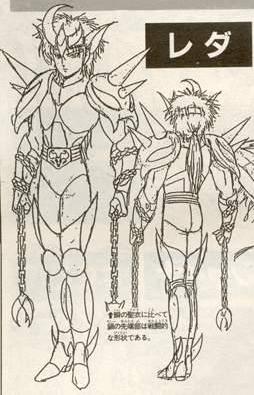 Sabemos por las imágenes del Anime que otros aprendices de caballero entrenaron en la isla Andrómeda y supuestamente también eran candidatos a la armadura del mismo nombre, pero muchos de ellos acabaron por llevar otras armaduras, como es el caso de June. Si aplicamos la "lógica June" a Spica y Reda nada obsta a pensar que todos ellos participaron en un torneo eliminatorio donde June y Spica fueron semifinalistas y Reda y Shun finalistas, así que ellos dos lograrían vestir otras armaduras, ¿de bronce?, seguramente, en todo caso podriamos llamarlas "lotes de consolación". Sus armaduras no recuerdan nada en especial, son de configuración parecida a las armaduras de Shun y Albiore pues ambos disponen de cadenas, equipación exclusiva de las cuatro cloth (nadie ha visto la de Casiopea, que pertenece al mito de esa familia), hay algunos elementos decorativos diferentes a los de la armadura de Shun, son diferentes el casco, las hombreras, las espinilleras, las espuelas y las cadenas, podemos imaginar que son copias modificadas.
