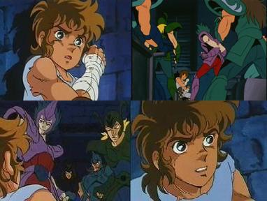 Si deducimos que una quincena de aprendices fueron enviados a la isla de Andrómeda para obtener una cloth y concluimos por las imágenes que 8 de ellos obtienen una de las armaduras que Albiore de Cefeo custodia en la isla, siguiendo toda lógica, podemos intuir igualmente que Albiore custodiaba otras armaduras aun no asignadas, entre ellas la armadura de Casiopea ¿no os parece?. Saint A, B, C. セイント エー ビー シー (Seinto Ee Bii Shii) “Santos A, B, C”. En el episodio 37 titulado “La llamada de la máscara, ¿amor o muerte?” (Kamen ga sakebu ! ¿ Ai ka shi ka ?) dialogando con Seiya, Aioria de Leo rememora la “traición” de su hermano Aioros, que se había escapado llevándose a Saori cuando era un bebe, recuerda como en su juventud fue insultado por la gente del Santuario, y explica como cuando todavía era un niño (debía tener 7 años) 6 caballeros del Santuario entraron en su casa, lo intimidaron, le preguntaron por el fugitivo Aioros y se burlaron de él al considerarlo hermano de un “traidor”. El caso es que aparece un grupo de aproximadamente 6 ó 7 Santos (siendo un recuerdo o flashback contado por el Santo de Leo) que atormentaban a Aioria cuando era pequeño y lo interrogan sobre el paradero de su hermano.