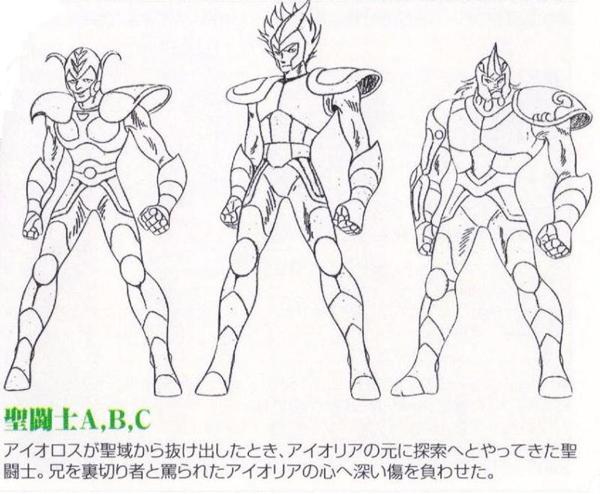 los 3 Saints claramente visibles (página 106) Oficialmente, lo único que se tiene respecto de ellos aparece en el artbook Jump Gold Selection 2 (septiembre de 1988, pág 106), los tres Saints claramente visibles son llamados " Saints A, B, C", sólo se describe brevemente a tres y no da ninguna información interesante, no se proporciona información sobre sus respectivas constelaciones y rangos, su presentación se situa entre las etapas de Silver Saints y Black Saints, algo que puede proporcionarnos una ligera pista. También en la parte que aparecen los soldados del Santuario y Jaki. Se dice expresamente que “son creaciones arbitrarias de los guionistas del anime, mucho menos buscados que Shiva, Ágora, Arachné, Cristal, Steel Saints…. al igual que 5 caballeros que se encuentran sobre la isla de Andrómeda junto a Reda, Spica y June." Estos santos son completamente un misterio. No se sabe que fue de ellos. Lo más probable es que se traten de santos de bronce del pasado. Pero todo esto es suposición. El objetivo de estos santos eran buscar el paradero de su hermano, Aioros. Entonces fueron a la casa de Aioria en busca de su hermano. Lo único que encontraron fue a Aioria que no sabía nada de lo ocurrido. Aioria explica que estos santos y otros tantos (soldados aparentemente) lo atormentaron y lo juzgaban como si también fuera un traidor de Athena. Incluso Aioria llegó a pensar que su hermano era realmente un traidor. Sobre las constelaciones o el tótem de estos santos no se sabe tampoco absolutamente nada. Y lo más asequible es que tampoco nunca más se sepa nada, ya que son personajes exclusivos del anime cuya misión es más bien prolongar el capítulo. Entrarían en la misma clasificación que los santos de la Isla Andrómeda del episodio 40 junto con Leda y Spica. Aunque estos últimos son santos actuales. Los otros Santos vivieron trece años antes. Artbook
