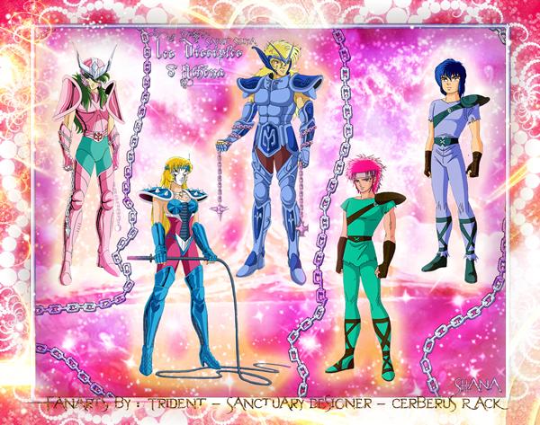 Fanarts de Arlès (Francia) No hay que olvidar la situación de los mangakas japoneses en los años 80/90, e incluso antes. En efecto, el manga pertenece tanto al mangaka que lo ha dibujado como a la casa editora de la revista donde se publica, entonces, cuando el dibujante vende los derechos para una adaptación en anime, el autor no tiene ningún poder sobre esa adaptación. Es por eso que existen los extraños añadidos aleatorios en el anime que nos sorprenden tanto, y que son incoherentes con el manga original. Por esa razó Kurumada ha re-comprado los derechos de sus series, como muchos mangakas, para controlarlas mejor. Muchos fans son conscientes que la trama televisiva de la saga del Santuario de Saint Seiya (sobretodo esta, las otras en menor medida) fue alterada y tenía muchas diferencias en comparación con la trama del Manga, el caso es que la difusión televisiva de la serie era más rápida (porque trabajaban muchas personas en ella) y atraparía enseguida al manga (porque Kurumada trabajaba solo), por ello los guionistas se vieron obligados a añadir numerosos elementos para alargar los acontecimientos y darle al manga tiempo para coger cierta ventaja, es aquí donde se rompe la coherencia argumental del manga, que no se tuvo en cuenta en la serie anime. Toei Animation creó muchos caballeros "nuevos", inéditos en el manga, que salían de la lógica de Saint Seiya, sin constelación u orden que pudiera identificarlos, y estos se usaron como “guest stars”, caballeros de bulto o de relleno, como hemos dicho, para que Kurumada tuviera más tiempo para dibujar el cómic, ya que ambos se publicaban el mismo año, y como no, también para fomentar la venda de más juguetes de Bandai (vaya si hicieron negocio!!!), ofrecer más enemigos a los caballeros de bronce y vender más episodios a la TV. Todos sabemos ya que estos personajes no salen en el manga y que por lo tanto no son "originales" de Kurumada, sinó un parche de Toei que hay que valorar cuidadosamente. Cuando leemos el manga vemos que es riguroso en la atribución de armaduras y constelaciones, una de sus grandes bases. No parece que Kurumada cometiera errores en ese sentido, en cambio los añadidos del Anime se hicieron con mayor y menor acierto... el rigor no es estricto con todos los personajes "nuevos", es evidente que los guionistas del Anime no pensaron ni un segundo en respetar los nombres de las constelaciones (salvo como hemos visto en los films de Eris y Abel) para crear sus personajes (quizás no les gustaban las constelaciones que quedaban libres, y buscaron otras cosas para inspirarse), al introducirlos estos dicen su nombre y siempre son caballero de X, la mayoría de veces sin constelación, "totem" celeste u objeto estelar de vanguardia. Puede que sea una extrapolación abusiva de fan intentar buscarles una constelación, vagas hipótesis de fans, pero cada uno es libre de creer lo que quiera, veamos caso por caso y que cada cual saque sus conclusiones... de todos modos dar categoría a personajes tan grotescos como estos parece tan imposible como inútil, pues siempre hay varias teorías sobre su verdadera naturaleza. Aquí analizaremos uno por uno todos los casos, encontraréis las opiniones de fans e hipótesis más versemblables sobre su verdadera naturaleza, lo único que si está claro es que el hecho de no ser obra del autor original del manga explica su incoherencia. 1. Los Figurantes Algunos aparecen muy poco, con un papel meramente figurativo - Los caballeros de la Isla de Andrómeda : En el episodio 40 titulado “Viaje al Santuario” (Ikuzo ! Oretachi no tabidachi), cuando Shun habla con June y se entera de que la isla de Andrómeda fue destruida por el Gold Saint Milo de Escorpión, la explicaciones de June vienen apoyadas por imágenes en las que Milo ataca la Isla de Andrómeda y sacude a sus habitantes, llegamos a ver por unos instantes a 8 caballeros con armaduras sagradas, de los que ignoramos sus respectivas constelaciones y rangos, junto al maestro Albiore, estos aparentemente son alumnos de Albiore que consiguieron obtener una armadura (por lógica de bronce), entre ellos reconocemos a tres: June de Camaleón, Reda y Spica, que estaban entre ellos (Shun se había marchado), quedarían otros 5 caballeros no identificados que fueron eliminados por Milo, al mismo tiempo que la Isla. Shun venció a la mayoria para conseguir la armadura de Andrómeda y los demás se tuvieron que conformar con armaduras secundarias, por lo que si Shun era el mejor de entre ellos y era un caballero de bronce los demás, por lógica, también deben ser de bronce, además, son demasiadas armaduras para que fuesen plata, y es imposible que estuvieran al mismo nivel que su maestro Albiore.
