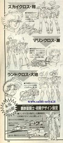 de su nombre: acero, Las Cloth de acero aparecen solamente en el anime, Cielo, Mar y Tierra, son tres armaduras de alta tecnología construídas por un científico (el Dr. Asamori) de la fundación Graad por orden de Mitsumasa Kido. Aunque estas corazas no eran verdaderas, fueron inspirados en constelaciones existentes. Estas y sus dueños se esfuman de la serie cuando los santos de bronce llegaron al Santuario, al principio de la saga de los 12 templos. Los caballeros de acero desaparecieron cuando los autores del anime se dieron cuenta que eran completamente anacrónicos, la naturaleza, forma y capacidades de sus armaduras pertenecen a otro tipo de anime y no a Saint Seiya. Su desaparición es furtiva para que los olvidemos rápidamente, podemos suponer que continúan trabajando para la Fundación Graad. Aunque las armaduras de los Steel Saint representan constelaciones y animales, oficialmente llevan el nombre de elementos: Daichi viste la Land Cloth, Sho la Sky Cloth y Ushio la Marine Cloth (Fuente Jump Gold 2). Estas cloths retoman justamente esas constelaciones, pero para no hacer redundancia con eventuales verdaderas Cloth se les dio un nombre diferente. En la serie TV se nos explica que Mitsumasa Kido fue el inventor de las armaduras de acero, escogió hacerlas parecidas a las del Santuario para proteger a Atenea. Tras volver de Grecia, Kido encargó a un científico llamado Asamori (o Mamori) que le fabricara unas armaduras dignas de caballeros de la era moderna, caballeros de acero que deberían ayudar a los de bronce. No le importaba cuanto costara, pero el trabajo tenía que estar acabado al cabo de diez años. El profesor no debía decírselo a nadie, ni siquiera a Saori. Cuando Mitsumasa Kido murió, ya había escogido a los tres jóvenes (Shô, Daichi y Ushio) que se convertirían en los caballeros del acero, éstos se entrenaban con tantas ganas que el profesor decidió seguir adelante con el proyecto solo. Los Caballeros del Acero aparecen por primera vez durante el combate de Hyoga contra Babel en el Coliseo. Es su intervención lo que permite a Hyoga recuperarse y derrotarle. Entonces nadie sabe quienes son y se los presenta de forma misteriosa, con la incertidumbre de si son amigos o enemigos. No es hasta tres episodios más tarde que el profesor se lo explica todo. Estos son aliados de los caballeros de bronce.