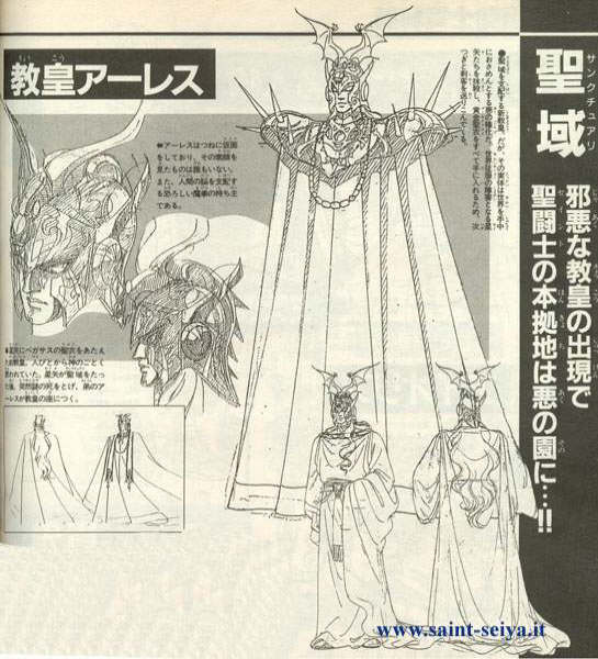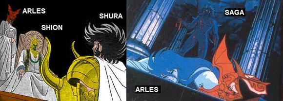 Conscientes quizás de ese "cáncer" del Anime, los responsables de Toei buscaron una solución al “caso Arles”, y en 1.988 publicaron en el Artbook JUMP GOLD SELECTION 2 o Anime Special 2 el Sidestory III “Excalibur Secret Chapter", una historia retrospectiva, paralela y complementaria del Anime -en la que participan Shura, Aioros, Saga, Shion y Arles-, concebida para aclarar de alguna manera la duda que instauraron. Así, el Sidestory ofrece información más precisa, pero que no deja de ser muy polémica, sobre el pasado y funciones del tal Arles. Arles es presentado -oficialmente esta vez- como 1) ex-santo de plata (genérico, no sabemos cual, los indicios apuntan a que fuera el caballero de plata de Altar) 2) hermano y 3) asistente del viejo Patriarca Shion en sus obligaciones. Arles aparece en las ilustraciones 4) vestido con las mismas ropas y máscara que las del Anime (aunque diferentes en forma y color a las del Patriarca Shion), y es 5) asesinado por el mismísimo Saga de Géminis en sus aposentos, el cual se viste con sus ropas para engañar y ordenar a Shura que mate a Aioros (el Patriarca Shion, aunque viejo, sigue vivo al final de la historia). Hasta aquí OK, pero, nos guste o no, el gran dilema de los fans alrededor de Arles es que si admitimos o no su existencia, deberemos decantarnos forzosamente por la versión Manga o la versión Anime+Sidestory de la saga del santuario de Saint Seiya -o combinar libremente los acontecimientos de ambas, a nuestro gusto- visto que las historias narradas en ambas fuentes son incompatibles de raíz con la presencia de Arles, y eso es muy fácil de demostrar.. 1) En el MANGA Saga de Géminis mata y suplanta a Shion-Patriarca, Arles no existe... 2) En el ANIME + SIDESTORY Saga de Géminis mata y suplanta a Arles-asistente, no sabemos con exactitud que le pasa realmente a Shion -si murió de viejo, se jubiló, lo mataron, lo raptaron, se fue de viaje...- podemos imaginar cualquier cosa visto que las ovas de la saga de Hades emitidas en 2.002 nos dejan KO al retomar la versión manga, si es que estos japoneses ya no saben lo que hacen.... Por lo tanto.. esto es lo que hay. ¿Cómo lo ves desde tu punto de vista de fan?, ¿a quien suplanta Saga? ¿a Arles (versión Anime)? ¿a Shion (versión manga)?, ¿o a ambos?, ¿como se explica la desaparición de uno y otro? ¿te sientes estafado?.... pfff, este es un tema tan complicado y largo de explicar que merece un análisis especial y extenso, si te preocupa saber más al respecto del trío Arles-Shion-Saga, te aconsejo que leas otro de los artículos de esta sección: El misterioso asesinato de Shion En realidad Arles no existe, el nombre se lo inventaron en el anime para referirse a Saga como Patriarca maligno. Arles es simplemente el nombre de una gran metedura de pata. Es un personaje que no existe en el manga, y los de Toei enredaron aun más la historia con la innecesaria historia paralela III (sidestory Excalibur Chapter) que dicen explicaba el asunto. Ademas, su aparición confundió a muchos fans que creyeron que por como se escriben en japones, Aaresu, Saga habia sido poseido por el dios de la guerra Ares, lo cual no es el caso en absoluto. Si sólo lo hubieran dejado como Saga, sin ponerle el nombre de Arles, todo habria quedado igual al manga original de Kurumada, en el que Saga no fue poseido ni nada... sinó afectado por doble personalidad. En parte, ese el origen de Kanon. Kurumada dijo en una entrevista publicada en un artbook que le costó mucho decidir si usaría gemelos, uno bueno y uno malo, o personalidad doble. Al final se decidió por esto ultimo, pero dijo que nunca iba a desechar la idea del gemelo malo, que luego usaria. Saga mato a Shion. En el manga, Kurumada lo muestra claramente en la parte final del conflicto de los 12 templos, meidnate imágenes retrospectivas, y lo reconfirma en el Hades Hen. Arles no existe en el manga, asi que Saga no pudo haber matado a quien no existe. En el anime aparece un Pontifice muerto, que aunque no es Shion, pues Kurumada ni siquiera lo habia concebido en el manga para entonces, podria decirse que es Shion para arreglar ligeramente el entuerto del anime, pero eso enredaria más las cosas pues resolveria una cosa pero dejaria otras dudas. Lo mejor es simplemente ignorar a Arles.