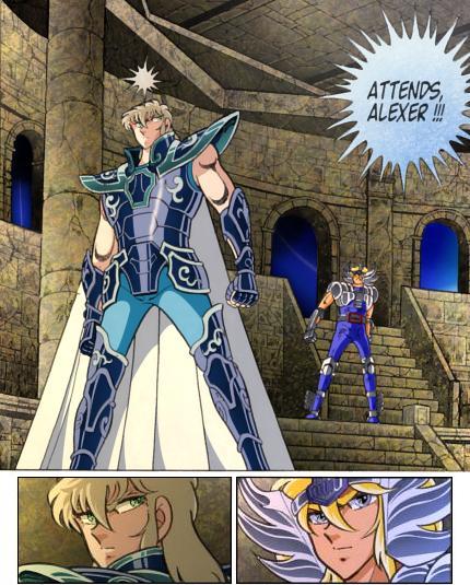 Armaduras de Bluegard ¿inseridas en la lista de las de Bronce?. 3 tienen la misma armadura (si se pueden calificar así sus protecciones), sólo la de Alexei es susceptible de ser una cloth. Para la constelación de Alexei, ninguna idea, pero para el rango, se diría que corresponde a un caballero de Plata, ya que Alexer tiene al menos ese nivel combativo, una teoría de fans es que Alexer (y sus ancestros antes que él) es un ex-saint (puede ser el de Boyero, ¿por qué no?). En cuanto a los tres guiñoles que le sirven, deben tener justo tener el nivel de un soldado con protecciones o caballero de Bronce... "los hombres de Alexer son simples guerreros de Blue Graad", sus armaduras son casi idénticas y se podría pensar que son un poco como las armaduras de los Fénix Negros o las de los "soldados" de Docrates o Jamian: copias de la armadura de su mestro o amo, pero sin gran poder con relación al original. Colorización de Jaxom (Francia) El caso del Guerrero Azul Alexer es especial. El Hipermito afirma que los Guerreros Azules surgiran de algunos de los Santos de Atenea (no dice el número), localizados en el Ártico, fundando una nación llamada Bluegraad (probablemente en Rusia, pero no reconocida actualmente por la comunidad internacional, como en el caso de Asgard). Prueba de que el traje de Alexer pertenecea la orden de Atenea, mas no se sabe su nombree, su clase y ni si posee constelación-guía. Como el Hipermito menciona más de un santo entre los antepasados de los Guerreros Azules, una hipótesis posible es que el traje de Cristal hubiera podido ser usado por alguno de esos guerreros, que tenían la misión de custodiar el ánfora en la que estaba sellada el alma de Poseidón en las tierras heladas. Algunos piensan que los Blue warriors no deben ser considerados saints pues rechazaron a Atenea y por consiguiente las cloth, que eran las armaduras de su ejército, las cuales debieron dejar de ser utilizadas por ellos, a no ser que se convirtieran en mercenarios y las usen, o que adoptaran otras, pero se hace dificil creer que lleven las mismas cloth sabiendo que ya no son más santos, sino simplemente descendientes de santos de 2º generación que rechazaron su juramento de fidelidad. Aparentemente los verdaderos santos de Atenea olvidaron que los Blue warrior existen, saben que existen 88 armaduras, pero como nunca se han reunido todas, no saben realmente donde se encuentran... y los Blue Warriorr olvidaron sus orígenes.. o sea que se da una especie de rechazo mutuo. La enciclopedia de Saint Seiya TAIZEN explica que los blue warriors son enemigos que tienen capacidades similares a los santos y define así a Blue graad: "este pueblo que vive sobre las tierras al extremo de siberie cerca del Círculo Polar Ártico. Se dice que fue exterminado hace varios siglos, pero vive aun hoy día una pequeña minoría". Una vez más, podemos comprobar que lo que dice el Hipermito y lo que dice Kurumada (incluso si no dice gran cosa a veces) en su enciclopedia no se corresponde. Según el Taizen los blue warriors no tendrían pues ninguna relación con el Santuario, muchos veran eso como un problema menos con el número de cloths.