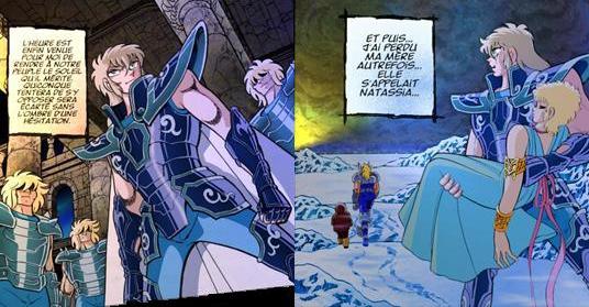Este pasaje se repetirá en la saga de Asgard, cuando Fler pide ayuda a Hyoga. Hyoga le presta su ayuda enfrentándose a Alexer con su armadura, que llega a sus manos por medio del pequeño Jacob. Durante el combate se dan cuenta de que Natassia ha decidido autoinmolarse al hielo como medio para detenerlos, y ambos se dirigen al exterior del palacio, donde se encuentra ella congelada en un bloque de hielo. Pyotr es el padre de Alexei y Natassia, y maestro de Blue Graad, desterró a su hijo por sus ambiciones de conquistar las tierras del sur. En el inicio de la historia Pyotr es asesinado por Alexei por oponerse a sus ambiciones. Pyotr es la forma eslava del nombre “Pedro” que significa “piedra” en griego. Pedro es el nombre del pescador que fue el primer discípulo de Jesucristo y más tarde se convirtió en el primer obispo de Roma y primer Papa del cristianismo, lo que es muy apropiado para el gobernador de Blue Graad. Como podemos observar, esta historia, si bien no fué llevada al anime (posiblemente por su corta extensión), está presente tanto en la Ova como en la serie.