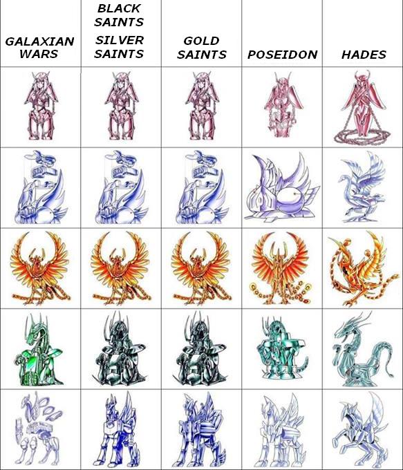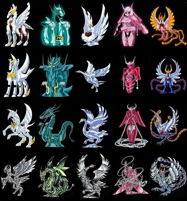 Vínculos a DEATHMASK HOMEPAGE (Italia) y All4Seiya (China) A través de todo el manga podemos ver 6 versiones distintas de la armadura de Pegaso, 5 de la armadura de Dragón y 4 versiones de las armaduras del Cisne, Andrómeda y Fénix (incluyendo las divinas). A nivel evolutivo hay que distinguir varios conceptos: Early Cloth, New Cloth, Gold Version, Final Cloth y God Cloth.