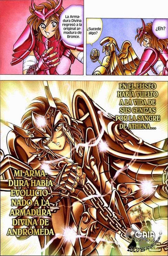 para que vuelvan a su estado original. Por ejemplo, cuando las cloth son reconstruidas está claro que la persona que las repara intenta hacer que la armadura sea más protectora y poderosa que en su primera versión, pero la armadura en sí continúa siendo la misma. Al final de las batallas, cuando todo acaba, los efectos de reparación o mejora desaparecen y la armadura vuelve a su estado original, como fue creada. La conversión de las Armaduras de Bronce en doradas, y posteriormente en divinas, son dos casos distintos pero en la base son similares. La conjunción de la sangre de los Caballeros de Oro, o de Atenea, más el cosmo del Caballero portador, hacen que la armadura cambie. Así, si por ejemplo Jabu viera su armadura bañada por la sangre de Atenea, pero no fuera capaz de elevar su cosmo próximo a niveles divinos, su Armadura NUNCA se trasformaría en una armadura Divina, ídem si fuera bañada con la sangre de un Caballero de Oro. Ahora bien, si Jabu consiguiera en medio de una batalla alcanzar el séptimo sentido, la sangre que impregna la armadura y su cosmo se juntarían en uno solo, y harían que su armadura obtuviera la capacidad y resistencia de una armadura de Oro, aunque el fenómeno sería sólo temporal. Al final de las batallas, una vez en reposo, las armaduras vuelven a ser de bronce corriente, que es su forma original. En LC Shiori usó las mismas armaduras del manga clásico y no las del anime, las pequeñas diferencias gráficas son sólo variaciones de un trazo y otro. Así que el baño de sangre cambia la forma y resistencia de las armaduras, unida al factor extra del cosmos del portador. 1: