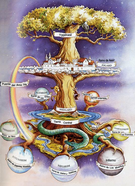 9 mundos del Yggdrasill En la mitología nórdica el mundo está representado como un disco plano. El disco está situado en las ramas de un gran árbol del mundo, el fresno YGGDRASILL, árbol de la vida, eje sobre el que descansa el universo, protector de los dioses y de los hombres, cuyas raíces y ramas mantienen unidos los diferentes mundos de los dioses, de los hombres, los gigantes y los muertos.. si muriera, significaría la destrucción total del mundo.