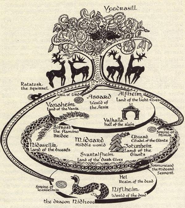 Este es un diagrama de los Nueve mundos nórdicos, mostrando la relación entre los varios reinos separados por planos dimensionales, la posición de los mundos superiores o inferiores no tiene importancia real pues no se encuentran en la misma dimensión. El número de enlaces naturales entre los reinos es desconocido. Los movimientos entre los mundos podían hacerlos solamente los dioses o los brujos.