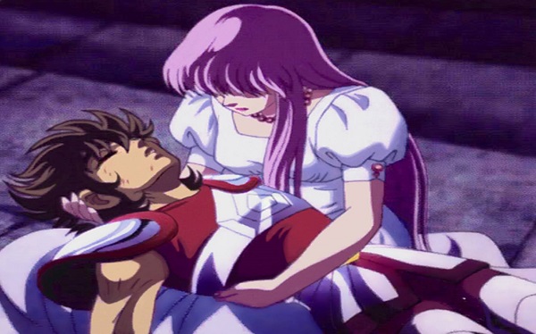 Cuando ese cálido sentimiento bullía en su pecho, de repente Saori dejaba de ser Atenea, volvía a ser una simple joven. Además, ahora cuando sentía la calidez del rostro de Seiya, herido y exhausto, como si durmiera reposando sobre su pecho, el dolor provocado por la flecha de oro disparada por Tremi de Flecha desaparecía y se convertía en una sensación de bienestar. Sin que ya los caballeros tuvieran que enfrentarse a crueles batallas, sin tener que llevar a sus espaldas la pesada responsabilidad de Atenea, así, de esta forma, deseaba estar para siempre. La expresión del rostro de Saori, que alzaba la vista lanzando una demanda a la estatua de Atenea que se alzaba dominante justo a su lado, era la expresión de Saori Kido, la simple chica que ciertamente parecía asustada como un pajarillo que empieza a levantar el vuelo. Había un hombre que se había quedado silenciosamente vigilando los movimientos de Saori, Mu caballero de oro de Aries.