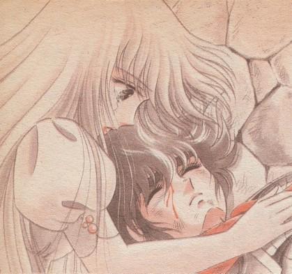 Saori sentía como todos ellos bajaban la cabeza ante la autoridad del presidente de la fundación Mitsumasa Kiddo, no ante ella por su voluntad. Su soledad, impaciencia, inestabilidad, ira... cuando se miraba a sí misma en los ojos de Seiya se daba cuenta de que eran iguales. Y mientras atormentaba a Seiya, a la vez, gritaba desde el fondo de su alma.