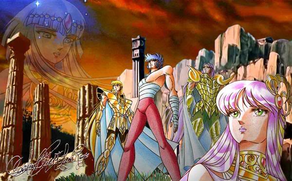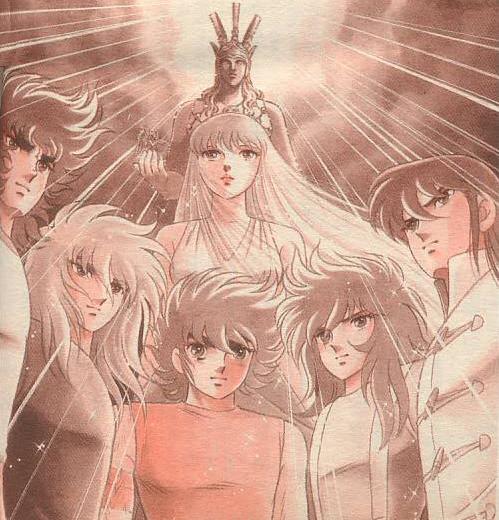 hacer ahora?- Tan pronto como comprendió su destino como Atenea, Saori había intentado asesinarse a sí misma. Hacía seis años que Seiya y los demás habían sido dispersados por el mundo para obtener sus armaduras. Cuando de nuevo volvieron a Japón ella les enfrentó a una nueva prueba, el llamado Torneo Galáctico. Sólo para conseguir sus armaduras habían sufrido muchísimo y ella cruelmente les había ordenado que lucharan entre ellos. Saori, ciertamente, se comportaba como la reina ante la cual los esclavos luchaban en el Coliseo, ya desde las antiguas leyendas griegas, se inclinaban y admiraban. Al menos no había duda de que así es como miraba a Seiya y a los otros. Incluso cuando el semblante de Seiya, que vestía la armadura de Pegaso y que se había desarrollado vigorosamente, desprendía la rebosante autoconfianza del caballero en que se había convertido y que se encontraba ante ella, los ojos de Saori que le contemplaban seguían viéndole como en el pasado. Saori se tragó sus palabras de agradecimiento para Seiya. De que serviría, decia ahora esas palabras. El cosmos que Atenea despertaba dentro de ella, sentía claramente que este torneo galáctico no sería más que un fácil preludio, y que de ahora en adelante excesivas batallas involucrarían a Seiya y los otros caballeros. Desde entonces, pasaron tiempos tormentosos y en algún momento desapareció la fría tirantez entre Saori y los Caballeros. En cada momento de duras pruebas o de repetidas batallas que se pasaban juntos, cada vez que superaban un obstáculo, la distancia se iba estrechando. Saori ya no era Saori Kido, era Atenea... Seiya y los otros caballeros de Atenea habían protegido a Saori y Saori también quería protegerles a ellos. -¡Saori San!, ¡Atenea!, ¡Seiya!-