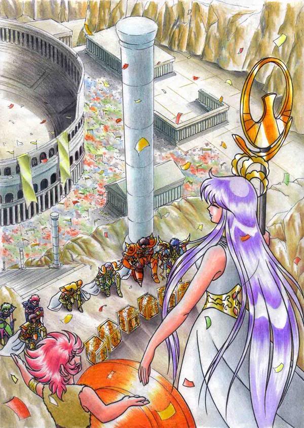 Fanart de Carlos Alberto Lam Reyes (Perú) Ese era el mismo sentimiento que albergaba Saori. El Santuario, que era un lugar que podría considerarase como un punto clave para el mantenimiento de la tierra, se había convertido en un campo de batalla y la sangre de muchos amigos había sido vertida. En la dulce y a la vez llena de fuerza sonrisa que Atenea devolvia a los que estaban ante ella no había nadie que pudiera percibir un solo punto oscuro.