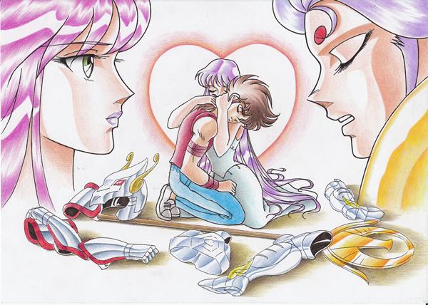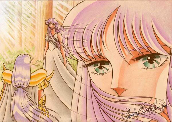 Fanart de Carlos Alberto Lam Reyes (Perú) Mu estaba leyendo su corazón y comprendía perfectamente que la muchacha que estaba ante él no era Atenea, era Saori Kido. -Pero si llegara a perder a Seiya yo... Sólo con pensarlo su autodominio se volvía incluso más frágil que el vestido de seda que llevaba. -Por