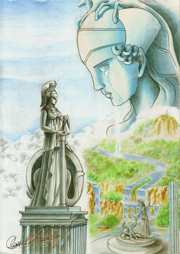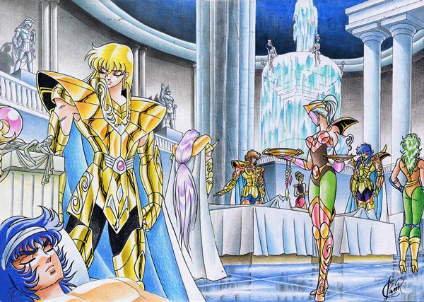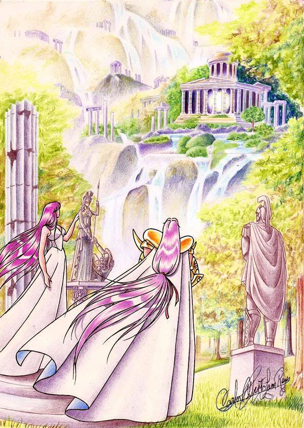 Fanart de Carlos Alberto Lam Reyes (Perú) -El amor de Atenea.... sólo en un caballero... en uno...- Saori tenía la sensación de poder oir los gemidos y el débil latido del pulso de Hyoga, Shiryu, Shun e Ikki que junto con Seiya permanecían tendidos sin sentido en la fuente de Atenea, intentando con todas sus fuerzas volver a hacer arder la llama de sus vidas que se desvanecía. Y no sólo eran ellos, el corazón de Saori se compungía al recordar los numerosos caballeros que por Atenea habían caido y vertido su sangre. Ante esta situación Mu le explicó a Saori el origen del nombre de la fuente de Atenea.