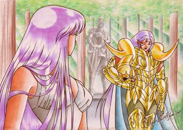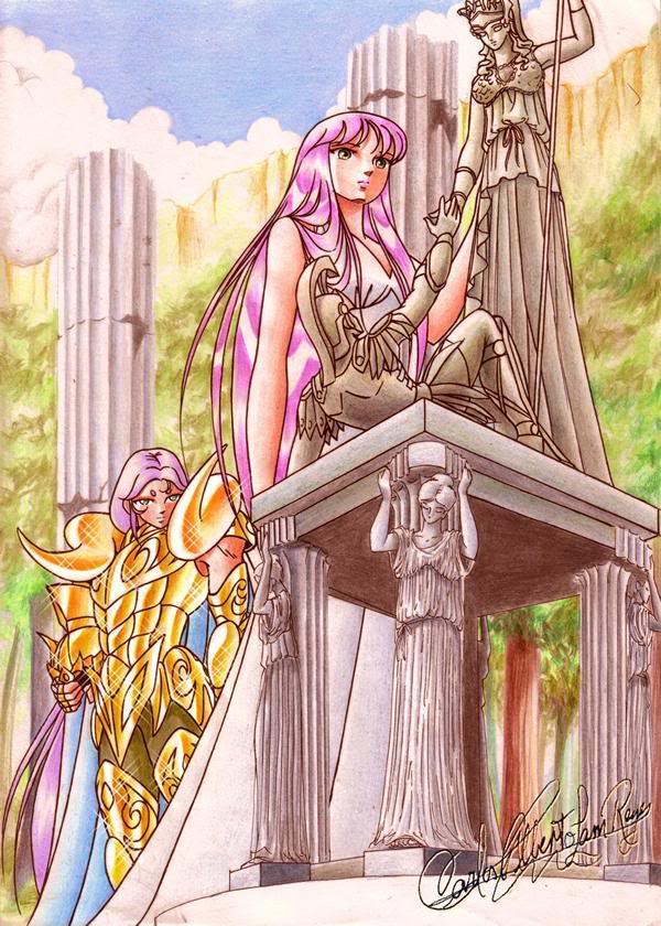 Fanart de Carlos Alberto Lam Reyes (Perú) Saori, aún con dolor, comprendió bien el sentido de lo que Mu quería indirectamente decirle con esa historia. Al volverse y mirar hacia el cielo, a través de los frondosos árboles, podía ver la expresión noble y a la vez dulce de la estatua de Atenea.