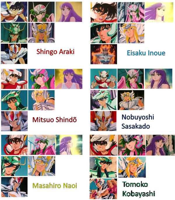 Para que podáis ver con vuestros propios ojos la diferencia entre los varios diseñadores del anime, aquí tenéis una pequeña tabla comparativa de screenshots (capturas de pantalla) del protagonista Seiya sacados del anime con el nombre del diseñador que ha trabajado en ellos ... es evidente que no son "lo mismo". Para ver las diferencias estilísticas de cada uno de los animadores principales, para vuestra comodidad todas las imágenes representan a Seiya con la misma armadura.