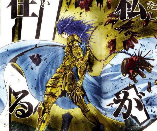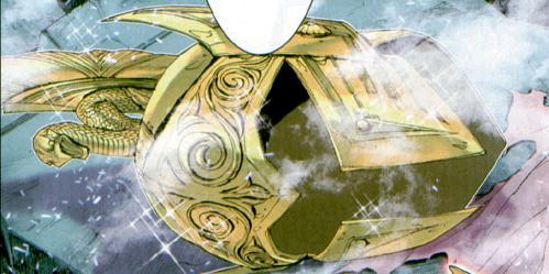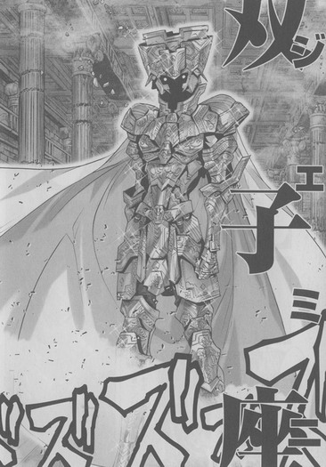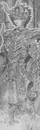 Saga se acerca entonces a un cofre en el cual está encerrado un misterioso hábito sagrado, en cuyo casco se distingue un dragón con las alas extendidas, mientras que las hombreras, adornadas con pinchos, destacan por su aspecto brutal. Luego menciona dos enemigos de Atenea, llamados Deimos y Fobos, que son hijos de Ares. - Saga : "Este hábito me protegerá de las intrusiones extranjeras y ocultará más fácilmente la naturaleza de mi cosmos, y eso aunque exista otro yo" Saga anuncia entonces a Death-Mask que siguiéndole, tiene todo a ganar y se hará más fuerte. Para él sin embargo, sólo hay un caballero de oro capaz de desplegar una energía comparable a la de una Super Nova, aquel que se dice es el más cercano a los dioses...