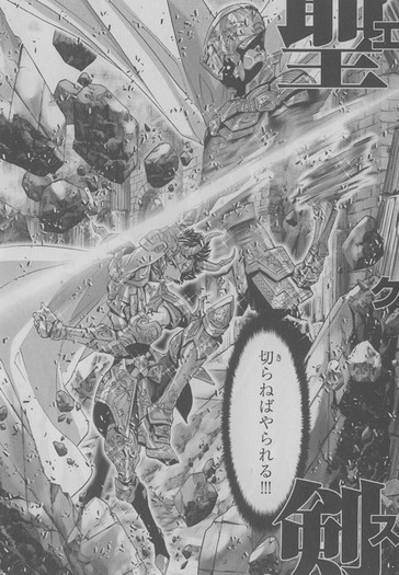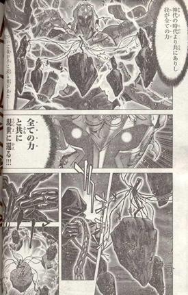 Capítulo 31 - ?? La estatua de Atenea esta cubierta por un humo negro, es el rastro dejado por la Explosion de Galaxias, ante la espectación de cientos de atenienses que presenciaron el combate. Todos se preguntan si el ser oscuro ha desaparecido por la explosión, pero un niño les dice que le parece ver que la diosa Atenea está rodeada por unas extrañas manos negras, enseguida se dan cuenta de que algo rodea la estatua de Atenea, es la silueta de la mano de Cronos, que sigue al acecho. Cronos está sorprendido por el poder destructivo de la explosión generada por Saga, y se percata de que el cosmos que emana de la estatua de Atenea lo ha protegido de recibir todo el impacto y que por ello se ha salvado. -CRONOS : "No llego a creer que conseguieras afectarme tanto, pues este cuerpo fue creado a partir del mismo cosmos que había forjado el dios Urano. Pero lo había elegido exactamente por eso. Su cosmos es asombrosamente poderoso. Afortunadamente para mí, el cosmos de Atenea contenido en su estatua me ha servido de protecion. ¡Qué ironía!! Pero como ahora ha desaparecido, nadie más me obstaculizará" Saga no aparece, da la impresión que no ha tenido la misma suerte, por lo que Cronos se dispone a coger su arma divina. Cronos extiende su mano para coger su arma divina, pero tras dispersarse el humo de la explosión, aparece de entre las cenizas la figura ensagrentada de Saga, sosteniendo en su mano derecha el Megas Drepanon, ante el asombro de Cronos, que lo daba por muerto. -Saga :"El sello creado por Zeus tiene la facultad de contener cualquier ataque. Como tu bien dijiste, es una ironía que te proteja el arma de tu adversario" -CRONOS : "Finalmente, eso prueba aún más hasta que punto te pareces a mí. Recibí ese arma divina de la mano de la diosa Gea, y tambien fue para matar a un dios. Tu seguirás realmente el mismo destino que yo" Cronos confiesa que fue él quien le dió a Saga la daga de oro para que matara a Atenea, porque sintió en él un inmenso cosmos, un cosmos de asesino. Saga sabe que es incapaz de controlar el espíritu maligno que lo posee, y le dice a Cronos que aunque le derrote algun dia será castigado por sus crimenes contra los dioses. -Saga :"Tengo en mí un cosmos maléfico... y sé muy bien que no soy lo bastante fuerte para liberarme. Eso implica que incluso sin el efecto del Oráculo de Teleos, habría sido un pecador culpable por haber asesinado a un dios" La mirada de Saga cambia para hacerse más firme, y asegura que si este Titan fuera un dios, no lamentaría matarlo. El Titan entonces decide utilizar contra Saga su 2ª técnica, llamada KHAOS "HYETOS", que es una lluvia negra como agujas afiladas que atraviesan el cuerpo de Saga, y que absorbe su vitalidad. Mientras Saga se retuerce de dolor, se le cae el Megas Drepanon... pero finalmente contraataca con su tecnica "Otra Dimensión", y le dice al dios que no debe subestimarlo por ser humano: Pero Cronos le explica que es inútil cualquier ataque contra él, ya que su cuerpo fisico no está en este mundo. -Saga : "¡Te aconsejo que mires bien a aquel al que tu elegiste Cronos!! Yo puedo ser débil, pero estoy seguro que tu también lo eres, ahora estas preparado para comprender de que se alimenta el corazón de un hombre... es la esperanza de construir un mundo mejor!" Cronos le dice que él es el dios del tiempo que siembra el futuro y que los humanos no pueden hacer nada contra él. -CRONOS : "Es imposible cambiar el futuro, incluso aqunque los seres humanos lo intenten con todo su cosmos, porque yo soy el rey de Titan vive para dominar el futuro" Pero un segundo ataque de Saga hace que Cronos se trague sus palabras. El caballero de Géminis se lanza otra vez contra su enemigo, hiriéndolo con un golpe cortante. Y Cronos no puede evitar soltar un grito del dolor cuando ve a su propio cuerpo perder gran cantidad de sangre divina, y se pregunta asombrado que esta ocurriendo, hasta que se da cuenta de que Saga sujeta en su mano la daga de oro con la que intentó matar a Atenea. -Saga : "¿Reconoces lo que tu mismo me diste? Un arma capaz de matar a un dios... que nosotros los caballeros no tenemos derecho a usar ... como tampoco tenemos derecho ni siquiera a tocar a un dios... pero yo estoy preparado para decidir mi futuro y sin dudarlo elijo proteger la paz en esta tierra" Saga se precipita sobre Cronos dispuesto a todo, sujentando la daga de oro y perdiendo mucha sangre, pero a mitad del camino el color de su pelo se vuelve negro, y entonces una lagrima aparece en su cara. Entonces su armadura le abandona y siente otra vez el efecto del Oráculo de Teleos, que lo paraliza totalmente y que le hace soltar la daga de oro: Saga