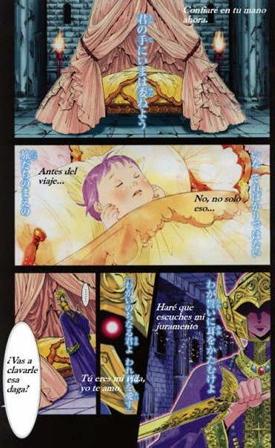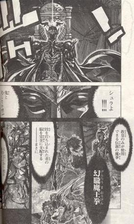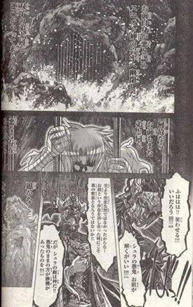 GENROUMAOUKEN!! (Ilusión diabólica!!) El Pontífice usurpador Saga ejecuta el rayo demoníaco (una técnica que según dice es exclusiva del Pope), sobre el cerebro del caballero de Capricornio, para así controlarlo y evitar que hable en contra de sus intereses. ¿Que sera de Shura?... Comentarios: Como hemos podido comprobar, a diferencia de lo que ocurre en la "escandalosa" escena versión Anime, en la que Shura intenta matar al bebe de Atenea y aparece como un loco sanguinario, en el caso del Episodio G la conducta de Shura es mucho más lógica ... Durante de la huida de Aioros (flash-back del capítulo 5), Shura sabe de inmediato que el bebé es Atenea y dice incluso que si debe herir a Aioros, procurará que Excalibur no afecte a Atenea, por lo que en ese momento, es fiel a Atenea, además, Shura no quería matar a Aioros. No comprendió su gesto. Creyó que éste actuaba bajo un impulso de locura y hasta al final intentó perdonarle la vida. Quería en realidad cortarle las piernas con Excalibur para dejarlo con vida. Pero Aioros se lanzó contra el ataque de Shura, cegándolo con su propia sangre y pudiendo así huir con Atenea. Más tarde, en el capítulo 13 (o sea 6 años más tarde), Shura sigue buscando la verdad, por eso va a ver al Pontífice en el capítulo 12 y allí descubre que el Gran Pope es Saga. Saga lo manipula entonces con el genrômaôken (en fin es lo que se supone, que Shura está poseido) y Shura decide ponerse del lado de este último. La versión Episodio G de esta historia es más coherente que la versión anime. En el anime, es gracias a Shiryu (cuando ambos ascienden hacia el espacio sideral) que comprende que Saori es la diosa Atenea. Lo que demuestra que el Anime y el Episode G van descoordinados, mientras que el Episodio G y el Manga se complementan bastante bien.