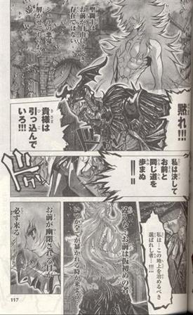 Capítulo 24 - "Aquel que se encontraba entre los dioses" - estancias privadas del Gran Pontífice - Saga sale de su baño, pensativo. El nuevo ataque de Aioria –La Explosión Fotónica- le recuerda su propia técnica -La Explosion de las Galaxias-, ambas causan un efecto similar, una concentración de energía similar a la de una Super Nova. Está asombrado de que un caballero tan joven como Aioria pueda desencadenar tanto poder... - Saga : "Él se reprocha no haber podido proteger a su hermano, por eso ahora intenta hacerlo con todas las personas que le son próximas. Es ciertamente como un expiación para él. ¿No piensas lo mismo que yo?" La persona a la que se dirige sale de la sombra, tras una esquina aparece su interlocutor, se trata del caballero dorado Máscara de Muerte de Cáncer... - Death-Mask : "No me importa esta historia. La única cosa que me interesa es la razón de la desaparición del verdadero Pontífice y, especialmente, porqué estas en su lugar, tú Saga, el caballero de Géminis" - Saga : "Tu sabes la verdad y por lo tanto, no me atacas. ¿Tengo que pensar que estas dispuesto a seguir jurándome fidelidad? ¿aceptas seguirme Mascara de Muerte?" - Death-Mask : "Si lo que construyes es un mundo donde la Fuerza esté por encima de la Justicia, entonces continuaré sirviéndote" Saga se regocija por tener un soporte como Death-Mask entre los caballeros de oro, pero se lamenta de que Shura no haya querido seguir el mismo camino y haya escogido oponerse. Death-Mask se asombra de que el nombre del caballero de Capricornio sea mencionado en la conversación, pero Saga se mantiene un poco evasivo. - Saga : "El corazón de Shura estaba demasiado lleno de justicia. No tenía otra opción que anular esa parte de él que no creia en mí. A pesar de todo, yo siempre he creido en él" Death-Mask no comprende demasiado las palabras de Saga, sólo espera una cosa. Ese nuevo mundo no debe depender de otras personas. Saga lo tranquiliza enseguida.