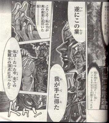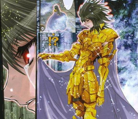Shura : “Me pregunto verdaderamente si este suceso no estará relacionado con la misteriosa desaparición del Santo dorado de Géminis hace 6 años ?.” Pero el Gran Pontífice se resiste a responder a esta última pregunta, y más allá de su silencio, se empieza a notar un misterioso cosmos emanando de él. Con una risa sádica, toma la palabra afirmando que el Santo de oro de Géminis se encuentra por lo tanto muy cerca de ellos.