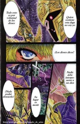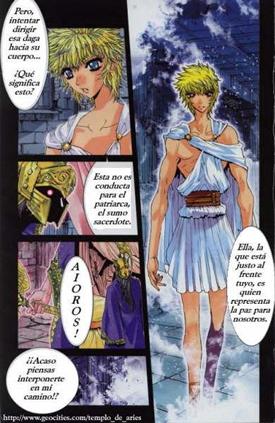 Aioros : “Pero ¿tu eres...?” Gran Pontífice : “Los has comprendido. Tendré que hacerte desaparecer, como a esta criatura cuya alma pertenece ya a las tinieblas tanto como la mia.” Pero Aioros rechaza aceptar ese destino. Su mirada se vuelve más triste. Aioros : “Mientras mi alma no sea tragada por las tinieblas, intentaré cambiar el destino de este bebe. Es Justo proteger a Atenea. Por esa única razón nosotros los santos existimos sobre la tierra.”