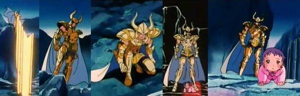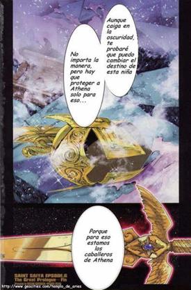 Capítulo 5 - "Los que se reúnen" Los hechos que rodearon la huida de Aioros los conocemos, al igual que en el Anime, nuevamente por boca de Shura de Capricornio, que lo narra a sus pares dorados durante la reunión de estos en el Santuario... La evocación del caballero de Sagitario, Aioros, hace rememorar a Shura los terribles acontecimientos sucedidos 6 años atrás. Shura explica entonces su incidente con Aioros y el bebe de Atenea. La escena cambia, es absolutamente nueva, de forma que innova el Manga y "rompe los esquemas" del Anime precedentes ... ya que no existía versión Manga de esa secuencia, y la huida de Aioros y su encuentro con Shura es completamente DIFERENTE a la versión TV.... mientras en el Anime Shura y Aioros entablan un combate vistoso, protegidos por sus respectivas armaduras doradas (en el curso del cual Shura esta a punto de matar al bebe de Atenea), en el Episodio G vemos como Aioros ni siquiera lleva puesta su armadura y se muestra muy pacífico y dialogante, rehúsa la lucha contra los soldados del Santuario que se le interponen y le reclaman que devuelva al bebe, conscientes que es la reencarnación de la diosa. FLASHBACK 1973 Los guardias del Santuario rompen la noche con sus artorchas, lanzados en la persecución de aquel que ha cometido el más abobinable de los crímenes : raptar a la diosa Atenea bebe. A pesar de las suplicas de los guardias, Aiolos rechaza devolver e incluso soltar a la niña que ha prometido proteger.