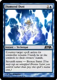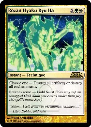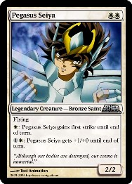SAINT SEIYA: MAGIC THE GATHERING SSMtG es un grupo de aficionados al conocidísimo juego de rol Magic: the Gathering que están haciendo una versión especial sobre Saint Seiya. Como todos saben, Magic: the Gathering, es un juego de rol que se juega con cartas y por turnos. En Magic, te conviertes en un mago que, utilizando una gran variedad de criaturas y hechizos, debes vencer a tu oponente, otro mago, y dejarle sin vidas. Saint Seiya es un universo que encaja de maravilla en la temática de este luego, ya que, en lugar de criaturas tenemos a caballeros de Atena, generales de Poseidón o espectros de Hades; y en lugar de hechizos hay cosmos y demás técnicas de combate. Y esto lo ha visto claramente el equipo de SSMtG, que con la ayuda de la informática (Photoshop) y el arte de cada uno, ya llevan creadas nada menos que 120 cartas de una calidad excelente con las que ya es posible jugar a una partida de "Magic: the Gathering" con los personajes de Saint Seiya.