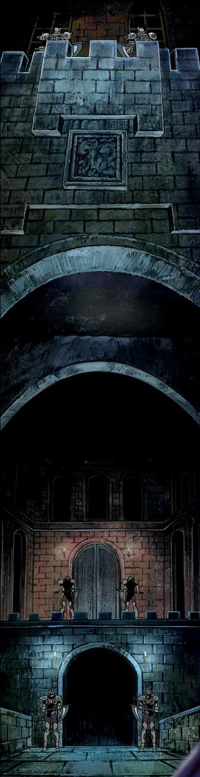 Patio Exterior: En la entrada del primero de los castillos existe un reducido patio que se extiende a lo largo de un profundo precipicio, del que emanan gases verdes constantemente, rodeado de estatuas que representan a demonios, es ahi precisamente donde tienen lugar los enfrentamientos entre Radamanthys, Aioria, Milo, Mu, Seiya y los demás caballeros de bronce.