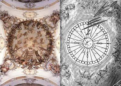 Abadía Benedictina de Ottobeuren - Le Scribe du Sanctuaire, Vincent sans pseudo (Francia) En el interior del Castillo de Hades, antiguamente habitado por la familia Heinstein, podemos observar una sala donde Pandora toca su arpa dorada, el centro del techo tiene una forma de cúpula donde hay una vidriera rodeada de frescos que representan ángeles querubines y damas en un paraíso o Limbo. Las referencias pueden ser muchas, pero la más cercana es la Abadía Benedictina de Ottobeuren, en Baviera. Estos frescos fueron realizados por Jakob Johann Zeiller en el siglo XVIII y han sido ejemplo del sorprendente estilo del barroco europeo.