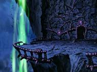 Hades Jō Oki no Rasenkaidan. ハーデス城奥の螺旋階段 “La Escalera Caracol del Interior del Castillo de Hades” o “La Escalera de Husillo del Interior del Castillo de Hades”. Garganta de Hades o de la muerte: En una habituación posterior a este recinto se encuentra la entrada al verdadero Inframundo, por medio de una enorme garganta. En el sótano del castillo hay un agujero rodeada por una escalera en espiral con arreglos y gárgolas góticas a su alrededor que conecta con el reino de los muertos. Tras cruzar un grueso porticón en el salón de Pandora, los protagonistas se internan por una caverna que esconde unas escaleras de caracol que descienden al Reino de Hades. A través de este enorme acantilado fluye el miasma, que es una emanación constante y perniciosa que se desprende de organismos enfermos, sustancias corruptas o aguas estancadas, este gas es de tonalidades verdes fluorescentes.