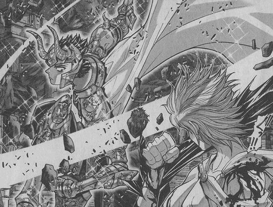 Sin embargo es descubierto e interceptado por Shura, Santo de Oro de Capricornio (que en ese momento tiene 10 años en el manga) y se inicia un combate ... Aioros se enfrenta con Shura, envuelto por la red de intrigas del falso Patriarca y que había sido envenenado en contra de su mejor amigo.