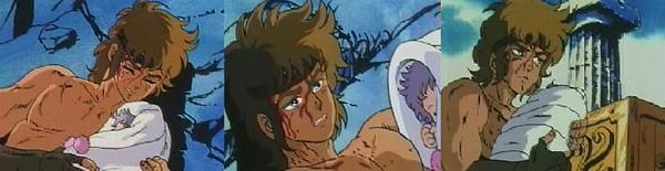 La notícia de la huída de Aioros y el rapto de Atenea hizo que todos los caballeros del Santuario se mobilizaran en su busca. 6 caballeros de bronce (muy probablemente) del Santuario irrumpieron en la casa de Aioria y lo interrogaron sobre el paradero de su hermano mayor, considerado ahora un traidor (el pequeño Aioria tiene 7 años y ya es un Gold en el manga, pero en el Anime aun es un aprendiz). Ese suceso marcó el futuro de Aioria... -----------------------------------------------------------------------------------------------------------------------------