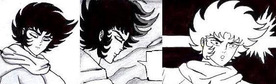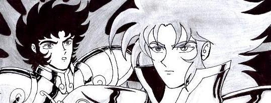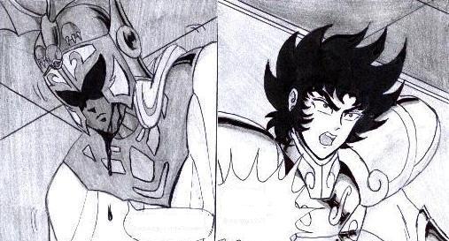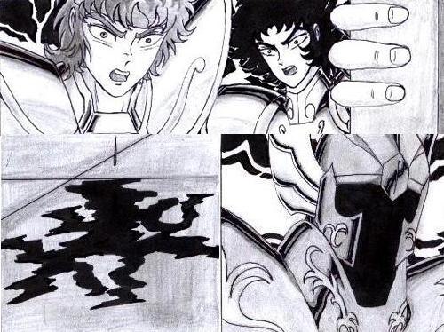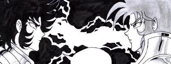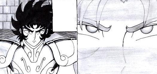 Los dos Caballeros se miran mutuamente, ojo con ojo y crean algunas chispas. (¿Qué...? En los ojos de Saga, hay una luz extraña). Los dos se quedan mirando mutuamente.