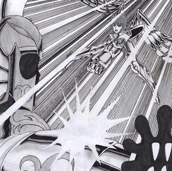 Pensando en este importante tema, él mira al frente. Cuando aún estaba en entrenamiento, aquí fue donde dio su sudor y sangre, este es el Sitio de Entrenamiento y al lado de éste, el Sitio de Combate. El joven camina al Sitio de Combate. Hace dos años, aquí fue donde obtuvo el grado de Caballero y su Armadura como prueba al vencer al último entrenado. Él recuerda todo esto perfectamente. Este joven fue el ganador. Cuando recuerda cómo ganó, se siente muy emocionado (Esa vez tuve mucha suerte... pero si fuera ahora, ganaría por mi fuerza). Su confianza no es falsa. En estos dos años, este joven ha entrenado duro en las montañas de España. Ha empezado a creer en él mismo. El joven inhala profundamente y contiene el aliento. Se concentra y cierra sus ojos. Deja salir el aliento. De todo su cuerpo emerge su Cosmo, un Cosmo que sale tan rápido como capas de hielo derritiéndose, como caballos saliendo de la cerca en una carrera. Todo el Cosmo ha salido en un gran impulso. El joven abre sus ojos lentamente. Decide que su objetivo será la cima de la montaña atrás de la Estatua de Atenea. Debe estar al menos a 3,000 metros... "¡Oah...!". En un instante, dirige su brazo derecho a la cima de la montaña. El poder del golpe corta a través del aire. Crea un sonido, volando a la velocidad de la luz. El poder no se detiene. Finalmente golpea la Casa del Patriarca en la cima de la Montaña Estrella. Se pude ver humo saliendo.
