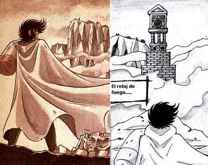 Fanart de Pandurinho (Mexico) El joven ve en el centro del Santuario el Reloj de Fuego. El Reloj de Fuego esta de frente a las 12 casas que se supone son protegidas por los Caballeros Dorados. Es sabido que las Doce Casas también tiene relación con las constelaciones de cada uno de los Caballeros Dorados. "La décima Casa es Capricornio", dice el joven recordando. El joven entonces fija su mirada en el Templo del Patriarca y la Estatua de Atenea (¿Ya habrá nacido Atenea...?).