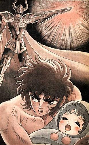 El joven, al ver esto, tiene un mal presentimiento. De pronto, detrás de él hay un poderoso Cosmo. (Uhmm, ese Cosmo es...). Él gira con una sonrisa en su cara. Es el Caballero Aioros de Sagitario, sonriéndole con afecto y cariño.