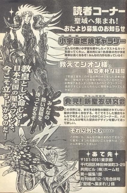usted. P) Hades tomó el cuerpo de Shun en la tierra (en el Inframundo), pero su cuerpo real está en Elysion. Poseidón tomó prestado el cuerpo de Julián, pero ¿no debe tener un cuerpo real? R) Sobre el rey del mar no sé los detalles, pero, por el hecho de que él tomara prestado el cuerpo de un joven de la familia Solo en cada generación, puede ser que su cuerpo real fuera destruido en una anterior guerra. ¿Cuándo la familia Solo y Poseidón pudieron tener esa relación tan fuerte? es definitivamente un tema para ser investigado. P) Tengo una pregunta. ¿Cuántas ediciones de Saint Seiya Digest habrá? Sería mejor si los Gold Saints como Seiya y los demás publican su digest. (Aunque, cuantas ediciones debería haber, no sé ...) De todos modos, hay mucha gente por ahí que quiere que esta publicación continúe. Bueno, supongo que esto no es realmente una pregunta para que la responda Sion sama ... Pido disculpas, pero, pregunto. R) Por el momento, el próximo número se ha planeado que sea el último. Por eso, si quieren que lea sus preguntas, escribánlas! y envienmelas rápido!. Sion Q&A Phoenix Issue Volumen