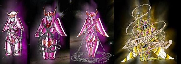 * 12. ¿Por qué hace falta sangre de los golds para reparar y reanimar la armadura del Fénix cuando es capaz de volver a la vida por si misma? Es una pequeña incoherencia del anime, en efecto, la Cloth del Fénix no necesita sangre para volver a la vida. En el manga no hay nada de eso, la única vez en la que esta Cloth recibe sangre es la de Atenea en Elision, para que pueda transformarse en God Cloth. En el manga, la cloth del Fénix pasa de la v1 a la v2 completamente sola, sin la sangre de los Gold, por lo tanto, su Cloth también puede evolucionar completamente sola. * 13. ¿Por qué Shura no lleva la espada Excalibur en su mano al igual que cualquier otro Caballero que posee un arma? Shura no lleva a Excalibur en su mano por la simple y buena razón que Excalibur no es un arma sinó una técnica de combate, Shura posee el alma de la espada en sus brazos y piernas. * 14. Historia de las armaduras en el manga Las cosas son bastante complejas para las armaduras llevadas por los caballeros de Bronce en el manga, existen (contando las God Cloths) 6 versiones de la armadura de Pegaso, 5 versiones de la armadura del Dragón y 4 versiones de las armaduras del Cisne, Andrómeda y Fénix. Armadura
