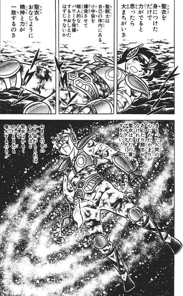 小宇宙を最大に燃やせ! (Ikuzo! Cosmo wo saidai ni moyase! Warera no inochi wo hitotsunishite...kono jigoku no okusoko ni....!! Hikari are!!!) ("Vamos! Que el Cosmo arda al maximo! Y al unir nuestras vidas en una, en lo mas profundo del infierno, habra luz!!!) Y en ese momento las lanzan y Kurumada dibujó el Cosmo de los Gold Saints ardiendo tras de ellas. En eso son similares a la flecha del Sagittarius Gold Cloth, que también puede absorber Cosmo. Pero sí, aunque las armas de Libra son capaces de absorber Cosmo, no es debido a esto que son tan poderosas, eso ya es una característica propia. El Cosmo que absorben simplemente les otorga más poder. * 53. ¿Por qué esa insistencia de Kurumada en comparar las armaduras con ropa? Según el concepto de la vestimenta de los antiguos griegos. El mismo Kurumada dijo en cierta ocasión que él baso los Cloths en las vestiduras clásicas griegas, los mantos largos y holgados por los que son conocidos. Fue por eso que decidió llamarlos Cloths, 'mantos' en inglés. En japonés, los kanji utilizados para escribir Cloth son 聖衣 (Sei'i, "Santa vestidura", con el furigana Kurosu (Cloth) encima). Ciertamente, todos los tipos de coraza llevan el kanji 衣 en japonés. Sólo los Scales no se compararían con ropajes, en inglés al menos, pues significa escama, aunque en japonés sus kanji son 鱗衣 (Rin'i, "Manto de Escamas", furigana Sukeiru (Scale)), es decir, en la escritura puramente en japonés sí se menciona que son un manto de escamas. Así que el mismo principio que aplicó Kurumada para nombrar a los Cloths, lo aplicó también a los Scales, los Surplices y los Kamu'i, pues todos están inspirados por las vestiduras de la antigua Grecia. * 54. ¿Por qué las Cloth de Marin y Shaina cubren pocas partes del cuerpo en comparación con otras Silver Cloth? Kurumada basó la apariencia de los Cloths en los uniformes escolares japoneses, así como basó los rangos en los del ejército japonés. A mayor edad y rango, mayor cobertura y ornamento en los uniformes. Es por eso que los Silver Cloths cubren más parte porcentual del cuerpo que los Bronze Cloths. Es simple cuestión de diseño en este caso: Kurumada hizo el Eagle y el Ophiuchus Cloth de una forma que permite al lector asumir instantáneamente que el portador es mujer, el diseño esta hecho para lucir de una forma más femenina. En el caso del Chamaeleon Cloth, esta cubre más porque hay obviamente cierta influencia del anime en Kurumada, para cuando diseñó el Chamaeleon Cloth y Juné aparece en el manga, el anime ya había comenzado. Su diseño es más elaborado que una típica Bronze Cloth, incluye botas largas, como las que Araki y Himeno incluyeron para los Bronze Cloths en el anime, y zapatos de tacón alto, como los que se añadieron a Shaina en el anime. Además, es evidente que hay cierta influencia de la imagen de dominatriz por el motivo del latigo. El Lyra Cloth y el Crateris Cloth cubren prácticamente igual que la mayoria de los Silver Cloths, compárense estos Cloths con el Perseus Cloth, el Kerberos Cloth, o el Crow Cloth, todos cubren casi tanto como los Gold Cloths. Lo que pasa es que algunos Silver Cloths, como el de Kerberos y Crow, fueron simplificados en el anime y ciertas piezas fueron removidas, motivos por los que en el anime parecen ofrecer menos protección, mientras que en el manga, si cubren igual que el Lyra Cloth y el Crateris. * 55. ¿De qué color es la armadura de Seiya, celeste o blanca? En el manga original el Pegasus Cloth es efectivamente de un color celeste claro, de un color similar al que se le dio en el anime, pero en pantalla es más plateado, es decir, los tonos celestes son menos intensos. En el manga su color se acerca más a tonos celestes, y en ND tiene estos mismos colores pero más intensos. * 56. ¿Por qué Seiya y Shiryu pudieron romper partes de Gold Cloths con la mano? ¿no es esto físicamente imposible en el Universo de Kurumada? Sí, se podría decir que son contradicciones al servicio de la trama. Para tratar de justificarlo, probablemente secciones de los Gold Cloths, como ornamentos o púas, sean fáciles de romper debido a que deben tener una menor concentración de Orichalcum, Gammanium y Star Dust Sand. Aun cuando en repetidas ocasiones se menciona que los Gold Cloths son virtualmente indestructibes y hay pruebas de sobra acerca de esto, es simplemente un plot device, pues a lo largo del manga original sólo sufren daño cuando Seiya corta el cuerno del mask del Taurus Gold Cloth, cuando Saga atraviesa el peto del Gemini Gold Cloth, cuando el Golden Arrow atraviesa el Sagittarius Gold Cloth y cuando Thanatos destruye 5 Gold Cloths a la vez. En cuanto a Shiryu, daña el Gold Cloth de Capricornio cuando "amputa" el brazo de Shura, lo cual no es canon, pues no sucedio en el manga. * 57. ¿Cómo Thanatos pudo romper CINCO Gold Cloths siendo un dios inferior a Poseidón?. En el manga se menciona que Hypnos y Thanatos son subordinados de Hades, pero que son dioses en toda su regla. Lo que significa que son extremadamente poderosos, simplemente Hades los supera a ambos aun asi. No son dioses menores, pero Zeus, Hades y Poseidón los superan con creces en cuestiones de poder. Hypnos mismo menciona que Hades le infunde respeto como para no manchar el Elysion con sangre humana. Aun cuando sean subordinados a Hades, poseen un poder infinitamente superior a un humano y eso le permitió a Thanatos destruir con suma facilidad 5 Gold Cloths, cosa que nunca habia sucedido desde la era de los mitos. Poseidón podría haberlo hecho si lo hubiera deseado, pero debemos recordar que él no es un dios maligno, es sencillamente alguien firme en sus juicios, pero parece no actuar guiado por una intencion malévola. Por lo que su intención era probablemente matar a los Saints sin causarles sufrimiento innecesario, todo lo contrario de Thanatos, que es por tal razón que destruyó los Gold Cloths, para poder seguir torturándolos antes de