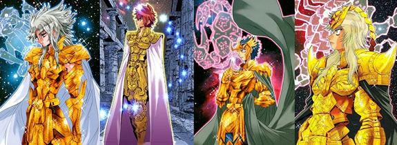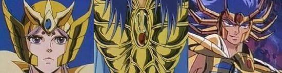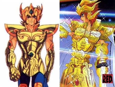 · Para concluir: En la versión inicial de Saint Seiya (el manga de Kurumada), no hay gemas en las armaduras de los caballeros de oro, y es igual en las portadas coloreadas y los artbooks. Se trata de un añadido del Anime, y generalmente estas adiciones no son muy coherentes; esta claro que sólo hay una voluntad estética en la elección de los colores de las gemas. Lo que es seguro es que Kurumada nunca puso piedras sobre las armaduras de oro, por lo tanto no se le puede acusar de nada, entonces, desde cierto punto de vista, la interpretación es estéril, dado que no hay... nada que interpretar. Los diseñadores del anime añadieron estas piedras (Araki seguramente) con el claro objetivo de ofrecer una mejora estética, punto y final. Moraleja: No se aprecia ninguna relación o vínculo entre los miembros de cada grupo, es fácil hacer complicado lo simple. La respuesta más evidente es que no tienen ningún significado válido, sólo estético o arbitrario, y que este tema es sólo una pura fantasía de fan que ha influido en los demás. Todas las teorías sobre su simbolismo son posibles pues no parece que Kurumada haya ido tan lejos en la interpretación. Para que podáis evaluar hasta donde llega la imaginación de los fans ... Un nuevo elemento puede venir a colación en este estudio: El Episode G. En el episodio G, Okada cambió los colores de algunas piedras en el caso de algunos Gold Saints, Aiolia y sobretodo Aiolos, con sus piedras azules por todas partes sobre la armadura... ¿quizás tiene un significado que proponernos...? En esta obra derivada, Megumu Okada incluyó el sistema de las gemas del colores usadas en el anime. La distribución sigue siendo igual, con la excepción de algunas permutaciones: - Aries pasa de una piedra azul (casco) a ninguna piedra, - A la inversa, Sagitario pasa de una ausencia de piedras a muchas piedras azules, - Leo cambia sus gemas azules (casco y cintura) por una roja (cintura), - Y a la inversa, Virgo pierde sus piedras rojas (casco y cintura) por una azul (pecho). El resultado obtenido tiene más coherencia que la repartición precedente del Anime, y parece transmitir un mensaje : - Gemas rojas : el mal personificado (Géminis), y animales feroces (Leo, Cáncer, Escorpión).