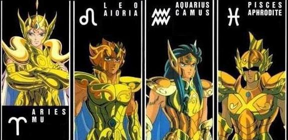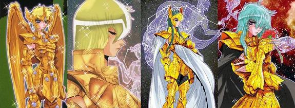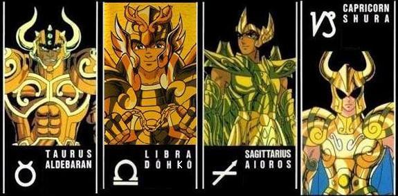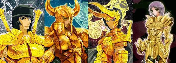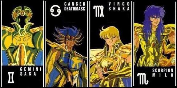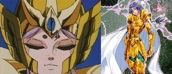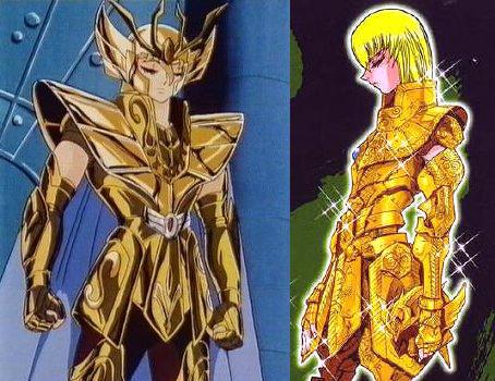 Tauro, Virgo y Capricornio (2 no tienen piedra y Shaka lleva una roja..) Si las piedras hubieran sido asignadas por elemento habría sido una idea muy interesante. Así habríamos podido ver por ejemplo las piedras rojas para los signos de fuego (Aries, Leo, Sagitario), amarillas para los signos de tierra (Tauro, Virgo, Capricornio), azules para los signos de aire (Géminis, Libra, Acuario) y verdes para los signos de agua (Cáncer, Escorpión, Piscis)... habría sido genial. No obstante, todas las reagrupaciones imaginables de signos zodiacales por elementos (aire, agua, tierra, fuego), por estación, por signos mutables (Géminis, Virgo, Sagitario, Piscis), fijos (Tauro, Leo, Escorpión, Acuario) y cardinales (Aries, Cáncer, Libra, Capricornio), por planetas protectores (Venus para Tauro y Libra, Júpiter para Sagitario y Piscis, etc..) carecen de sentido pues no hay vínculo entre el número y color de las piedras y los caballeros escogidos. - La naturaleza de la constelación : No corresponde del todo, el grupo de las gemas rojas representa a dos animales (Escorpión y Cáncer) y dos personajes (Géminis y Virgo), y pasa lo mismo con los otros agrupamientos. - El hemisferio (Norte o Sur) en el que se encuentra la constelación : No hay nada concluyente. Rojas: Virgo(N); Géminis(N); Cáncer(N); Escorpio(S). - El país de obtención de las armaduras : Géminis, Escorpion, Leo y Sagitario son armaduras que se adquirieron en Grecia, esta hipótesis no concuerda. - Elementos cambiantes : Otra hipótesis sería que las piedras fueran "cambiantes", tal como ocurre con las armaduras, entonces estarían vinculadas a la organización del santuario, serían distribuidas por el Gran Patriarca en cada época para asignar funciones a los caballeros de oro (guardia de Atenea, seguridad interna, misiones exteriores) o bien la distribución podría estar vinculada a una decisión de los dioses cuya razón desconocemos (tema de fanfic) o también en función de la naturaleza del cosmos del Caballero de oro. Después de todo, las armaduras pueden evolucionar según los tiempos. Eso ya no tiene nada de sorprendente para los fans, dado que se dice que están vivas y vistos los cambios de las armaduras de bronce de los protagonistas o el casco de Sagitario, que se adaptan también a la forma física y al sexo del portador (imagínense sino a Cassios revestido con la armadura de Shaina, serían bien necesarios algunas modificaciones estructurales de las corazas) pues, ¿por qué no? quizás también varien en función de la psicología y al poder del caballero. Según este postulado, al asociar la piedra a la naturaleza del cosmos del caballero (poder y psicología) en vez de a su signo (aunque el poder y el signo estén estrechamente vinculados), podríamos sugerir las siguientes reagrupaciones: Armadura sin piedras para guerreros cuya armadura incluye un arma: Flecha de Aioros, Espada de Shura, las 12 armas de Dhoko ...., y para Aldebarán, bah, por los cuernos o quizás la similitud de su técnica con el sable del samurai. Piedras rojas para aquellos con cosmos de extensión/introspección: las dimensiones de Saga, ondas de Hades de DM, 7 Mundos del samsara de Shaka, explosión atómica de Milo. Piedras azules para los cosmos vinculados a la protección y a la física de los cuerpos: Hielos de Camus, Flores protectoras de Aphrodite, reparación de las armaduras de Mu y poder de curación de Aioria. Otros tienen la visión de que las piedras son amuletos o condecoraciones, siguiendo hipótesis completamente excéntricas, que Mu y DM viajaron a Escandinavia y se llevaron los zafiros de los God Warrios, y que los llevan como trofeos, o que Aldebarán perdió su piedra roja a manos de DM antes de que Seiya le rompiera el cuerno... bueno pararemos aqui, ¿os parece? Es todo un poco esotérico, abierto a dictámenes contradictorios. Al final acabaremos llamando a los productores del Anime para saber porqué Spartan tiene un aura dorada (es el único "Silver" que tiene una, ¿será otro alumno de Shion?)