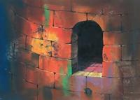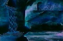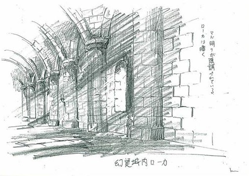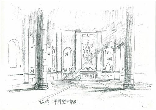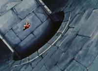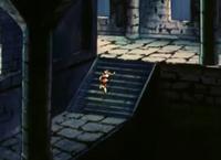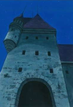 El interior es espacioso y frío además de carecer de cualquier ornamentación en las paredes o techo (a excepción de alguna columna). Todo el lugar está en penumbra, también debido a que afuera es de noche. Seiya sube las escaleras y llega a una gran sala circular situada seguramente en alguna almena del castillo, esto se explica por su forma y porque es en una almena donde estaba Giste cuando llegó el helicóptero y desde la que lanzó su ataque hipnótico.