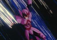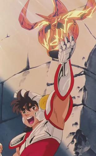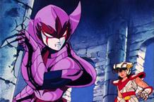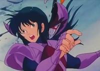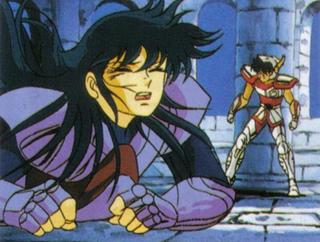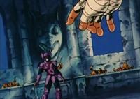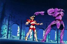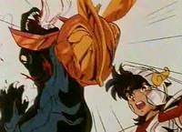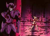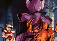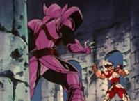 Por mucho que quieran hacernos creer que forma parte de la lógica del combate, a nadie escapa el hecho de que decirle a una mujer que se es capaz de distinguir su presencia entre las dobles debido a su olor, es equivalente a llamarle sucia… con todas las letras. O sea, que ya comenzamos faltando al respeto. Basta con que Giste deje los jueguecitos ilusorios, salga de su escondite y se ponga seria para que Pegaso se vea reducido e inmovilizado por sus garras. Pero claro, los guionistas siempre tienen un as guardado en la manga. Al igual que pasó con Fénix, enseguida una voluntad justiciera se apropia de la armadura de oro, acudiendo en defensa de su protegido e impactando de forma brutal en Giste, que lógicamente no se esperaba tal ataque procedente de un objeto supuestamente inerte. Tras rozar la muerte, Seiya consigue vencer a Giste con la ayuda del casco de oro.