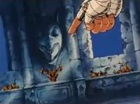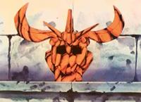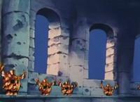 En esa sala hay una pared que tiene una gran escultura de un monstruo o un diablo y bajo ella un gran número de cascos de la armadura de oro de Sagitario. Seiya consigue descubrir cuál es el original lanzando un ataque contra ellos y destrozando las copias.