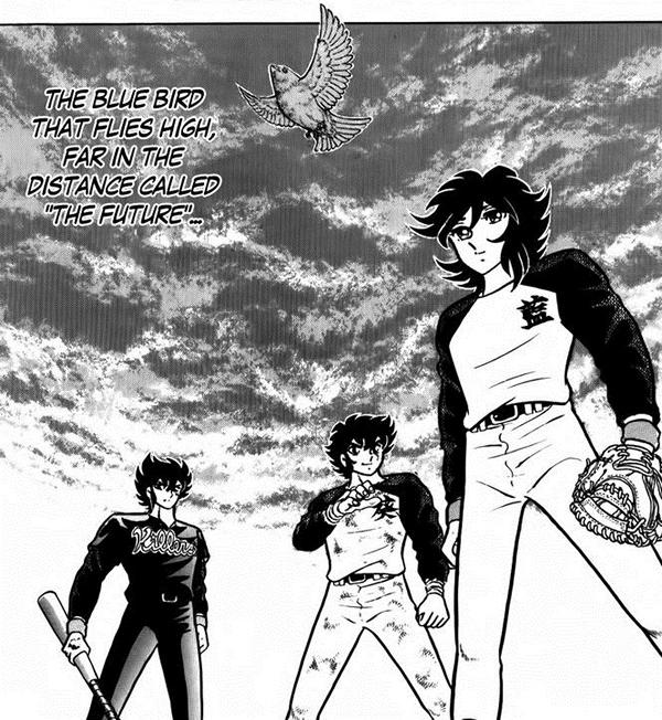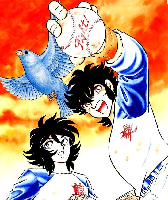 A su vez, Shingo tiene un hermano menor llamado Ryugo Ouki (muy parecido física y psicológicamente a Deathmask de Cáncer) un bateador que está muy celoso del éxito y talento de su hermano mayor y que tras conocer a Aoi y comprobar sus habilidades de lanzamiento, quiere retarlo y derrotarlo por todos los medios. El tema del pájaro azul es mencionado como una fabula relacionada con un ave que trae la felicidad. El protagonista Aoi grita el nombre de sus lanzamientos cuando los ejecuta (fastball, thunder ball, roar ball o forkball) de forma similar a los Saints cuando lanzan sus ataques cósmicos.