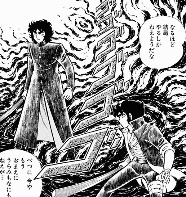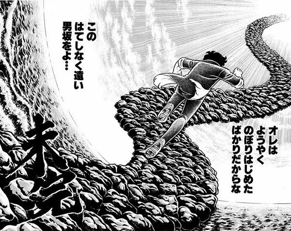 Bueno... esta fue la primera y última saga de Otoko Zaka, porque la serie fue finalmente cerrada después de apenas seis meses de su publicación. Un tremendo golpe, porque Kurumada planeó la serie durante diez largos años cuando hacía sus otros trabajos. Su plan era convertir Otoko Zaka en un manga eterno. La serie que el había previsto fuera la gran obra de su vida y por la que merecía tener su nombre en el contexto de las grandes estrellas de la manga, murió súbitamente. El manga de la vida de un hombre no podía simplemente ser cancelado, pero Otoko Zaka lo fue después de apenas 3 volúmenes, con la última página diciendo "未完" (mikan / incompleto) en lugar del habitual "完" (kan / completo).