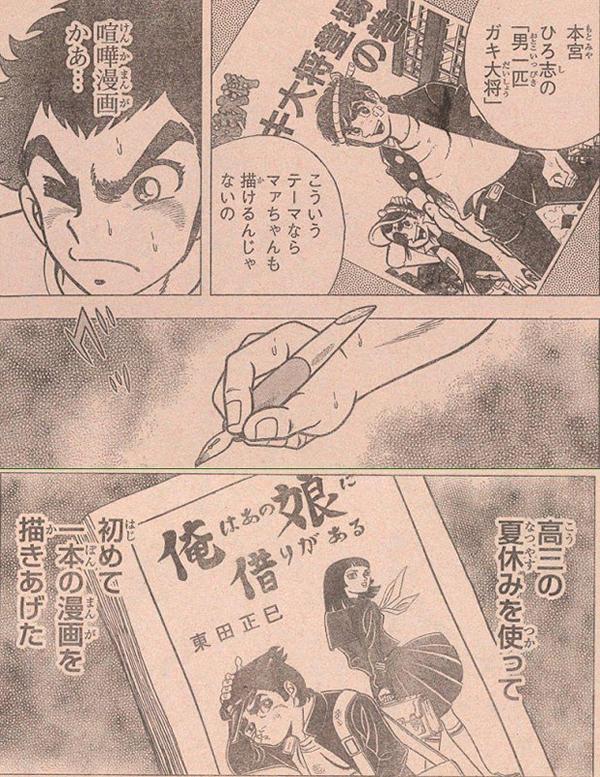 Champion Red. (2013) ¿Y cuál fue lo que le hizo decidirse a dar los primeros pasos hacia la profesión de mangaka? Kurumada: “Fue Otoko ippiki gaki daishô, una obra del maestro Hiroshi Motomiya que comenzó a publicarse en el mismo año de la creación de la Shônen Jump. Fue un gran impacto para mí. Yo me preguntaba “¿tal vez yo sería capaz de dibujar historias utilizando esta clase de universos?”. Y durante el verano de mi último año de preparatoria, periodo en el que debía decidir si seguiría una carrera, vi en la Shônen Jump un artículo anunciando un nuevo concurso, y me dije a mí mismo que debería participar. Fue en ese momento en que realmente dibujé mis primeras páginas. 31 páginas realizadas durante las vacaciones de verano.” ¿Y cuál fue el resultado de esa primera participación? Kurumada: “Como no tenía la paciencia para esperar los resultados en la revista, me dirigí directamente al departamento editorial, en octubre. Después de todo, si no había esperanzas para la carrera de mangaka, eso me iba a hacer pensar de nuevo en mi futuro. El responsable de la editorial que me recibió buscó las páginas de mi manga entre todas las que habían enviado, y me dijo que lo encontró “muy interesante”. ¿Usted se encontraba ansioso? Kurumada: “En efecto. Él entonces me preguntó: “¿Te gustaría convertirte en asistente de mangaka?”, y pensé que esa sería una buena oportunidad. Volverme asistente era la mejor opción para mejorar mis dibujos y verdaderamente entrar en el ambiente profesional. Y así fue como me convertí en asistente del maestro Koo Inoue, que estaba publicando Samurai Giants.” ● Entrevista realizada a Masami Kurumada, incluida en el anexo intitulado “Ai no Jidai - Begin” (“La era del índigo”)! que vino incluido en la Champion Red #10 de 2017, salida a la venta el día 19 de agosto. Kurumada: “Cuando estaba en los primeros años de la primaria, me gustaba leer cosas como “Iga no kagemaru” o “Yûyake Banchô”, pero en los últimos años de la misma comencé a ir a la tienda de renta de libros de mi vecindario. En aquella época, en donde yo vivía, allí era donde se concentraba el entretenimiento. Cosas como “Ninja bugeichô” de Sanpei Shirato, el cual mostraba un mundo cruel, no contenía aquella justicia ideal de los otros mangas. Allí se utilizaban páginas dobles para las escenas principales, y quedé maravillado por esa dinámica. En especial, fue de Eîchi Arikawa de quien recibí más influencia. Me atraían mucho “Chôsen shikaku” y “Chameleon ken”, así que comencé a practicar dibujando mangas de manera autodidacta." Kurumada: “Cuando estaba en tercer año de preparatoria, mi profesor me preguntó: “¿Qué harás cuando termines la preparatoria?”, y en los siguientes 4 meses dibujé “Ore wa ano musume ni kari ga aru” (“En deuda con esa chica”). Había recibido una fuerte influencia de “Taiyô no koibito” de Eiji Kazama. Más tarde, también de Takumi Nagayasu. En lo que respecta al dibujo de personajes, pienso que estas dos personas eran las mejores en aquella época. Personajes como el conductor de colectivo están basados en los personajes secundarios de ese tipo que solían aparecer en los "gekiga" de Eîchi Arikawa (Gekiga: Tipo de manga con un estilo dramático y más adulto). Como en aquella época no tenía screentones, el rayado tuve que hacerlo yo mismo. Me estaba introduciendo (en el mundo del manga) de manera prolija, ¿no es así? (Risas.) Keiko Fuji (madre de Hikaru Utada) era muy popular en aquella época, así que su imagen terminó influyendo en el estilo de peinado del personaje femenino. Debido a que todo lo que hacía era de manera autodidacta, dibujé los personajes de arriba hacia abajo sin saber que primero debía crear un guion gráfico. El manga terminó teniendo 31 páginas en total y lo llevé a la Shônen Jump donde se publicaba "Otoko ippiki gaki daishô". Viéndolo ahora nuevamente, se siente como que quedó demasiado resumido. Participé en el concurso, pero no obtuve ni siquiera una mención de honor. “Ore wa ano musume ni kari ga aru” no consiguió ganar el concurso, sin embargo, conseguí trabajo como asistente de un autor que era publicado allí. Mientras me encontraba en la preparatoria iba cada domingo, pero luego de graduarme me convertí en asistente formalmente. Me mantenía ocupado 5 días a la semana, pero como no podía comer sólo con eso, comencé a hacer un trabajo de medio tiempo los domingos. Los mangas los dibujaba el día que me quedaba libre. Un trabajo que hice en ese periodo es “Shiosai no uta” (“Poema del sonido de las olas”). El “kakeami” (Kakeami: técnica de dibujo que consiste en dibujar pequeñas líneas para generar texturas) en el uniforme escolar fue influenciado por Tadashi Matsumori. Imité su técnica del “kakeami”, que en esa época era llamada “kunekune”. Practiqué mucho para poder dibujar esas finas líneas con la pluma. Pensaba que en alguna ocasión debería usar el nunchaku en mis mangas. Y cuando me puse a pensar cómo podría hacer para que el personaje lo bloqueara, alguien me dijo: “Que utilice una toalla mojada”. Gracias a que realicé varios trabajos de medio tiempo, pude conocer a mucha gente. El nunchaku era originalmente un arma del karate de Okinawa y yo no estaba familiarizado con ésta, así que pensé que sería una buena arma para los malos. Estaba convencido de que era una gran idea ya que anteriormente había sido todo un éxito con Bruce Lee. Cuando su film “Moeyo Dragon” (Conocida en Estados Unidos como “Enter the Dragon”, fue una película de artes marciales protagonizada por Bruce Lee, la cual fue estrenada en 1973 a pocos días de su fallecimiento) se estrenó, pasó algo lamentable, ¿no es así?. En realidad, mis obras anteriores a mi debut me avergüenzan y no quiero verlas. Pero me pondría feliz si existieran, aunque sea, algunas pe