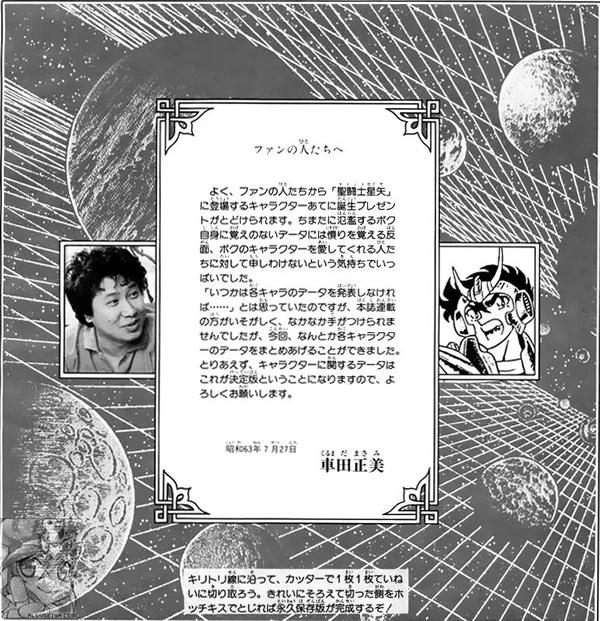 Entrevista revista Men’s Walker, 25 abril 2000 (Japón) Kurumada: “En cuanto a Saint Seiya, yo quise que se convirtiera en un manga popular desde el comienzo, para superar el sentimiento de “algo incompleto” que tuve con Fûma no Kojirô y Otoko zaka. Las cosas se dieron como esperaba; ganó una gran popularidad. La popularidad explotó en el invierno de 1986, cuando el anime comenzó. En cuanto a eso, el manga también se hizo vistosamente popular cuando Saori Kido se convirtió en Athena y los Silver Saints aparecieron. La popularidad aumentó notoriamente debido al efecto multiplicador del anime y del manga, que eran muy impresionantes. Mantuvo esa popularidad por un período considerable de tiempo, pero sentí que estaba perdiendo todas las energías que tenía con la Saga de Hades, y le pedí a Shûeisha que me dejase terminar de escribir Saint Seiya en algo más de diez semanas.” ●